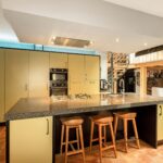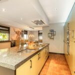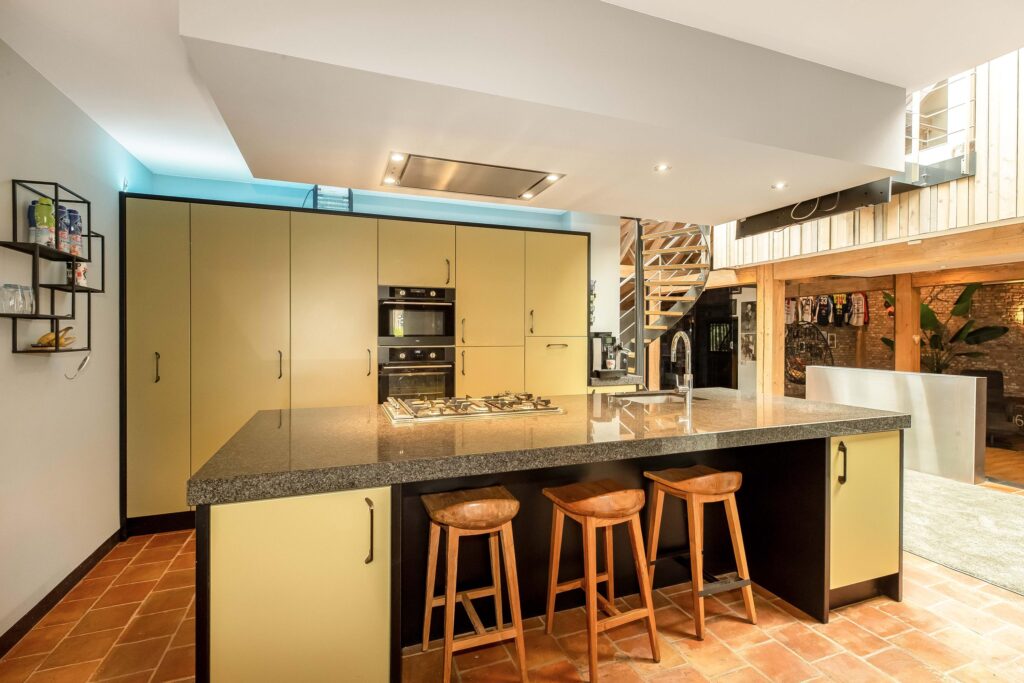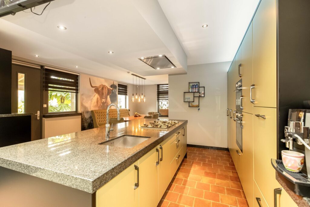 De leefkeuken is uitgevoerd met hoogwaardige materialen waaronder een royaal natuurstenen werkblad, gecombineerd met moderne inbouwapparatuur waaronder een vaatwasser, koelkast, vriezer, 5-pits gaskookplaat, twee ovens, een combi-oven en een Quooker-kraan.