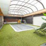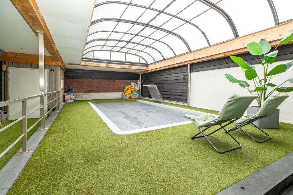 Het zwembad beschikt over een waterval, jetstream en een hydrodek. Aan het zwembad is een 2e overdekt terras gelegen met toegang tot de garage.