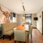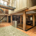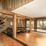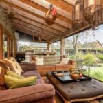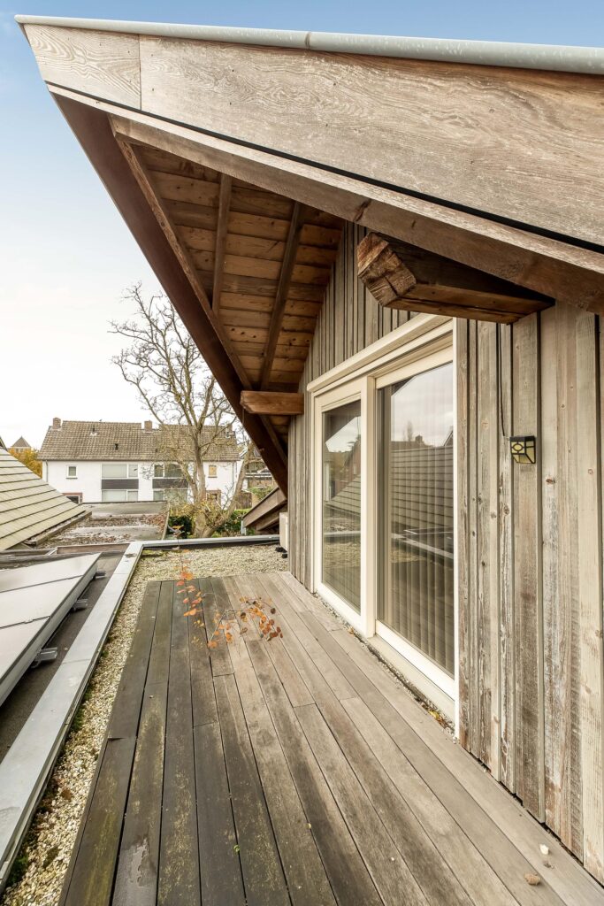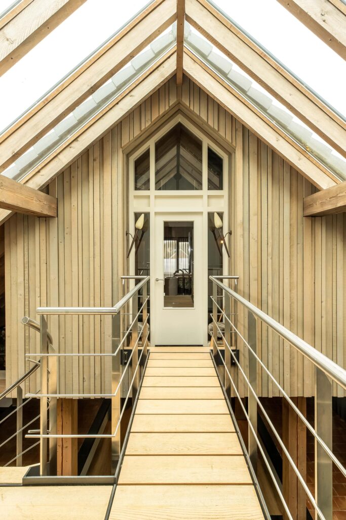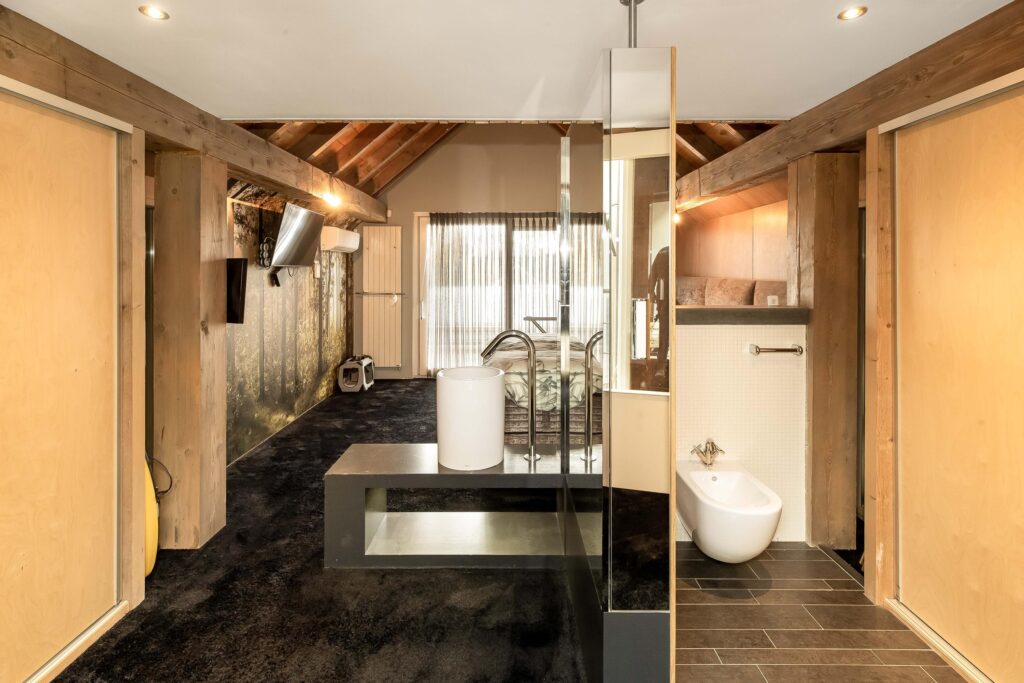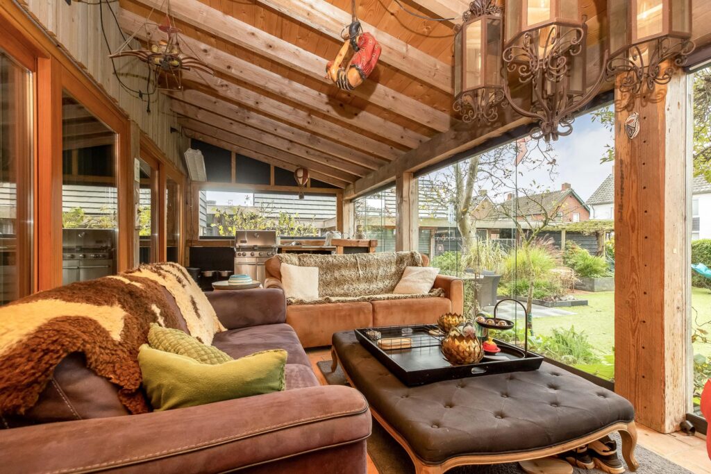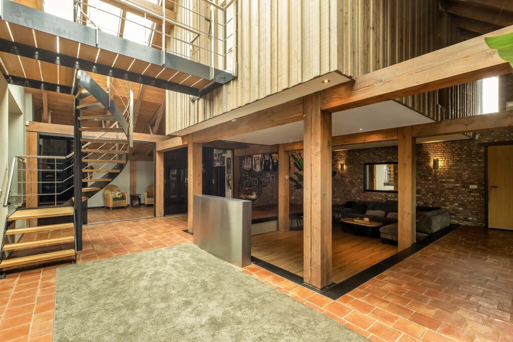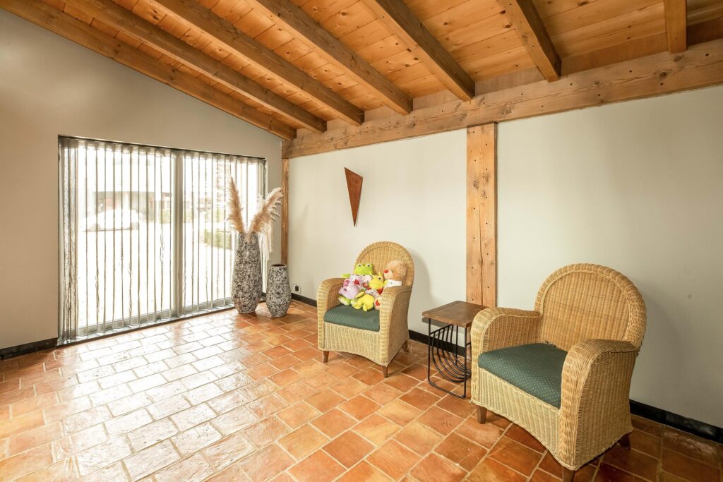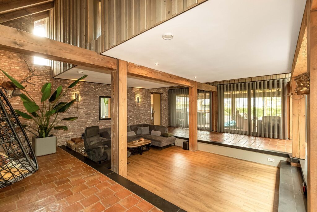 De riante woonkamer is centraal in de woning gelegen en geniet van veel lichtinval dankzij een hoge vide met glazen dak en 3 schuifpuien die toegang bieden tot het overdekt terras. In de woonkamer zijn prachtige behandeld vuren houten balken zichtbaar alsmede de hoge nok van de woning.