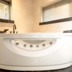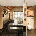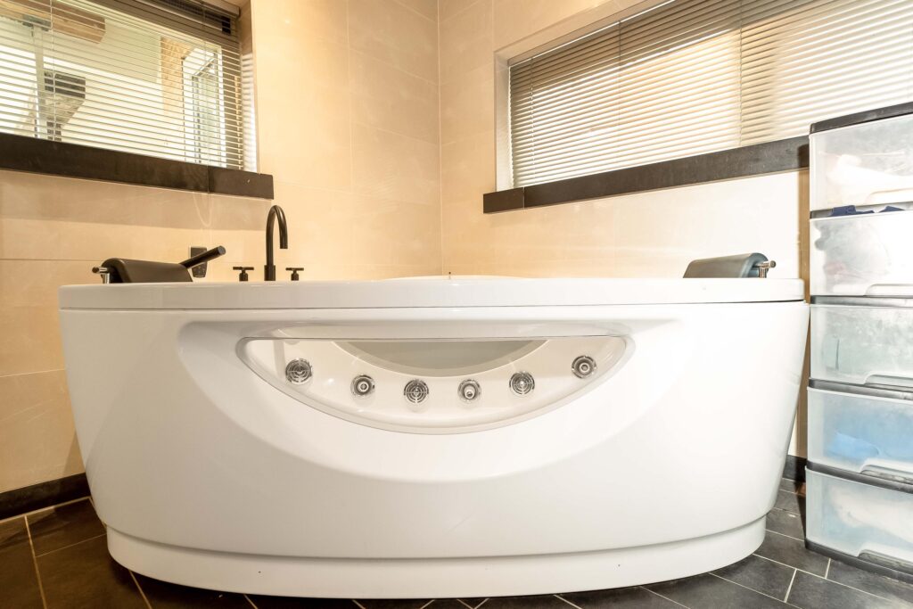 De ruime badkamer op de begane grond beschikt over een luxe ligbad met o.a. jetstreams, een royale inloopdouche met solarium en regendouche, dubbele wastafel in luxe bad meubel met een natuurstenen blad, hangend toilet en een designradiator. Een vaste trap biedt toegang tot de ouderslaapkamer op de 1e verdieping.