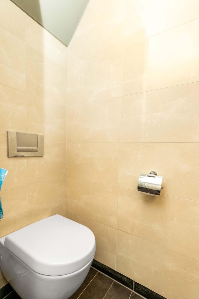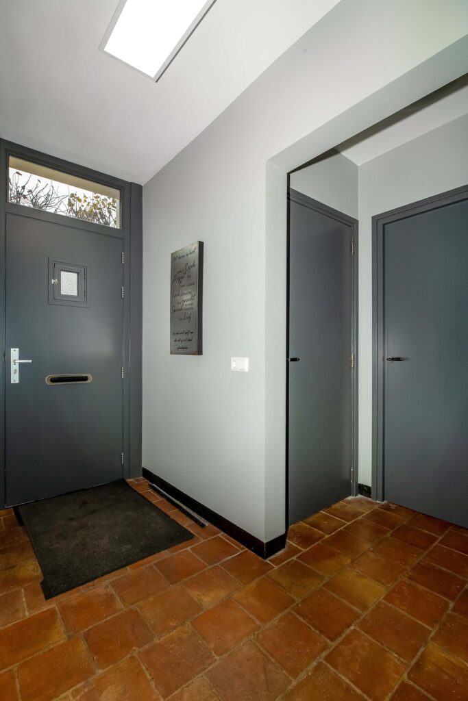 Bij binnenkomst in de ruime entreehal heeft u toegang tot de meterkast, een luxe afgewerkte toiletruimte, een praktische wasruimte en de kelder.