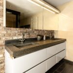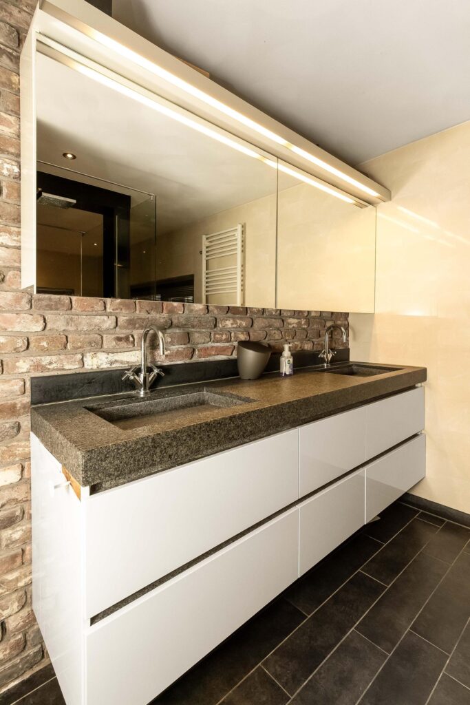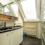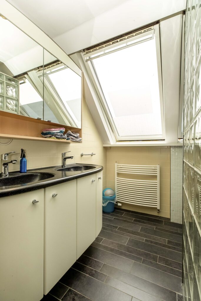 De 2e badkamer is aan de voorzijde van de woning gelegen en geniet veel lichtinval dankzij twee grote dakvensters. Deze badkamer is voorzien van een douchecabine met massagestralen, hangend toilet en een dubbele wastafel in een badmeubel.