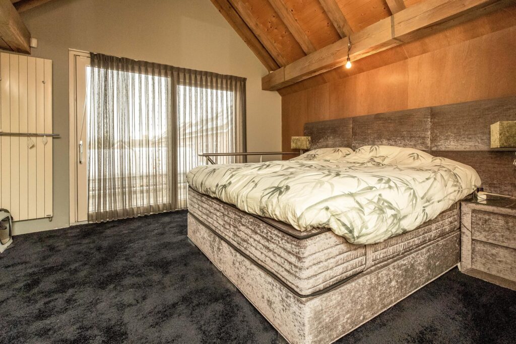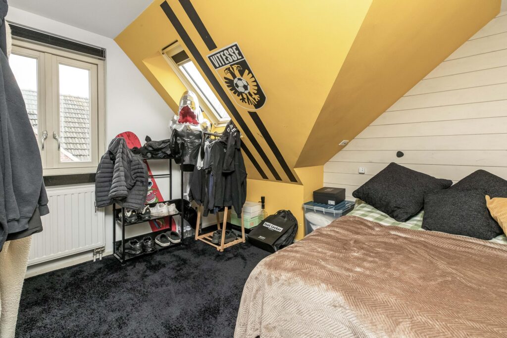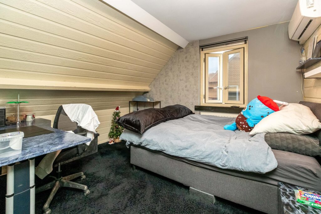 De ouderslaapkamer is aan de achterzijde van de woning gelegen heeft een prachtig hoog plafond, afgewerkt met hout. In de ouderslaapkamer is een ruime vaste kast aanwezig en een wastafel met spiegel en een bidet.