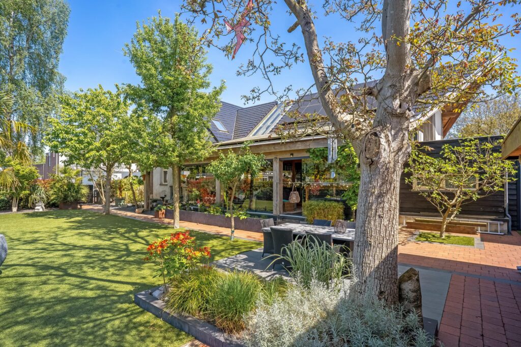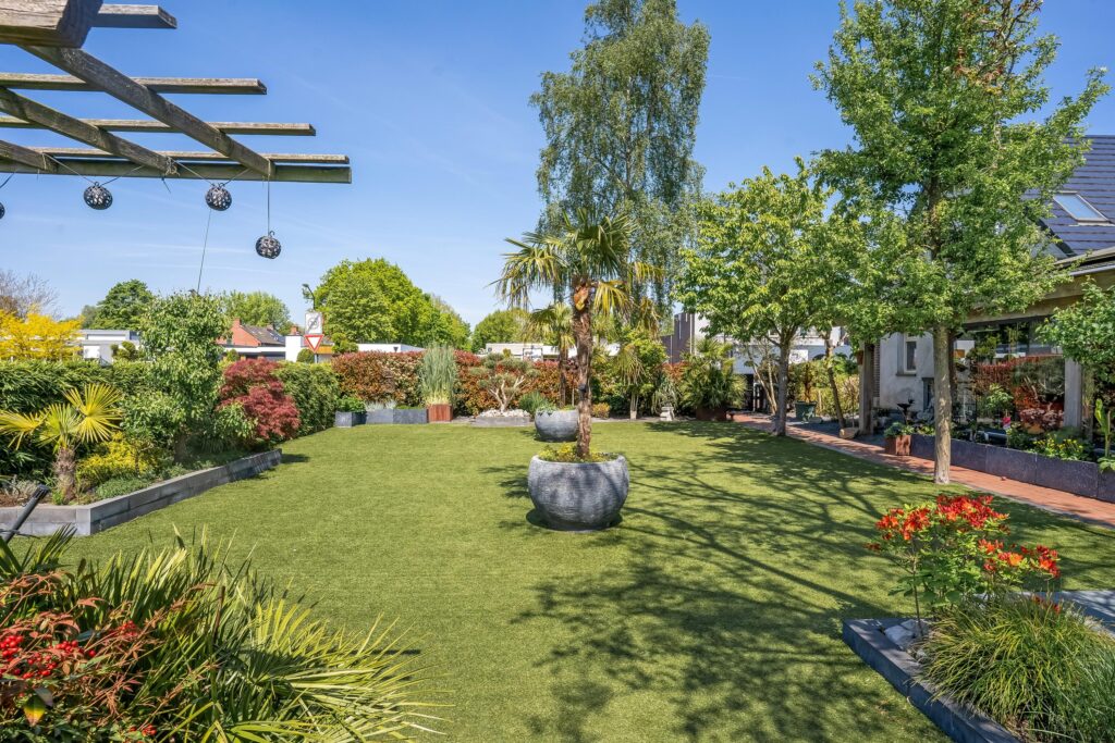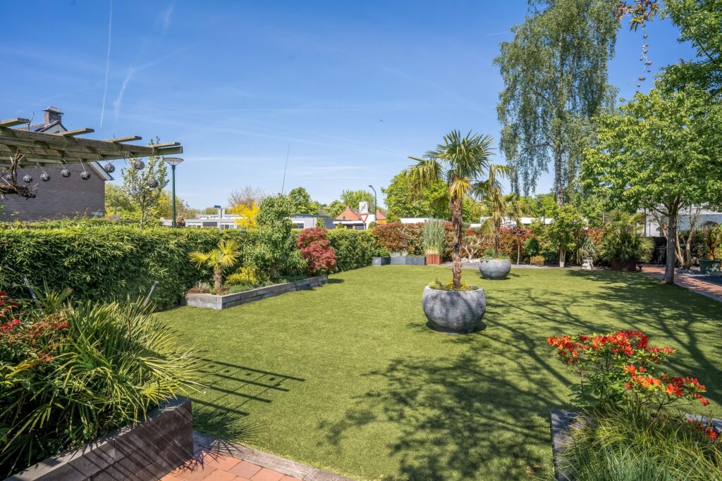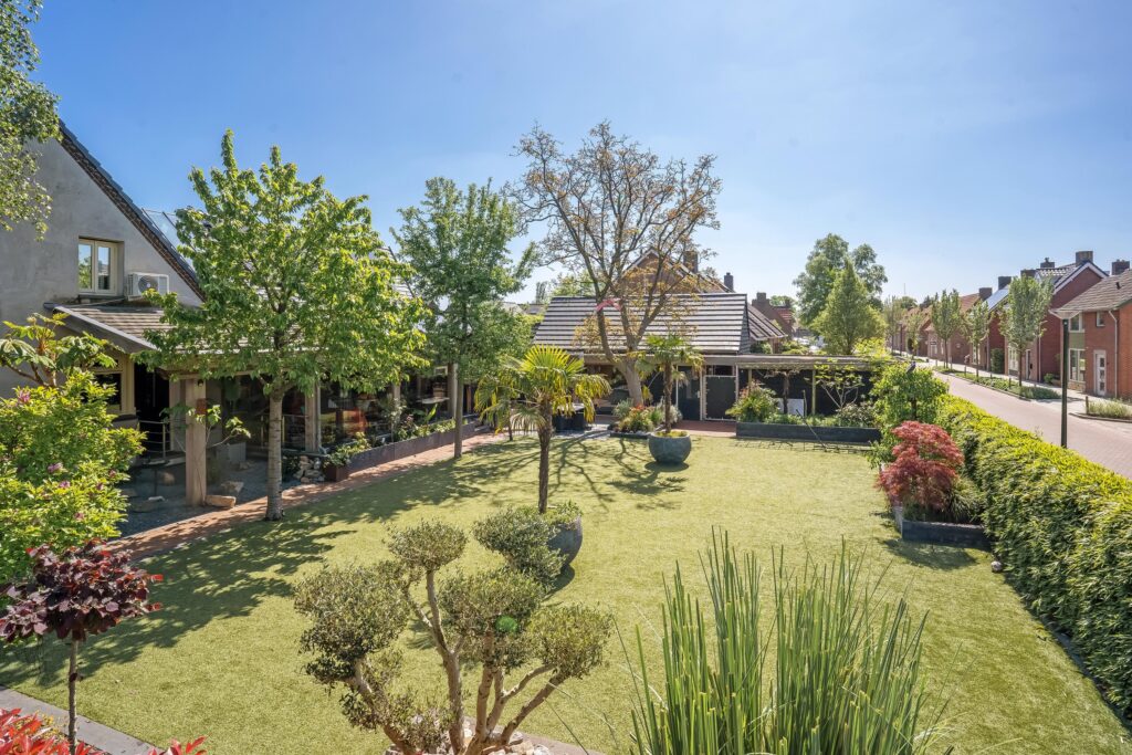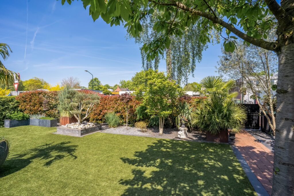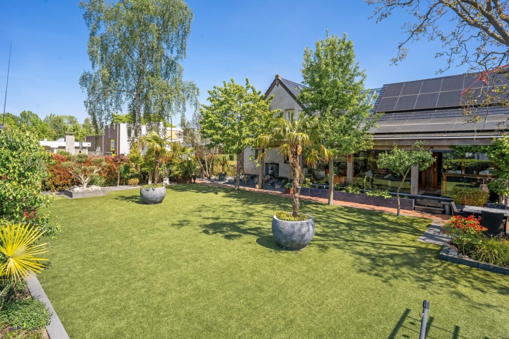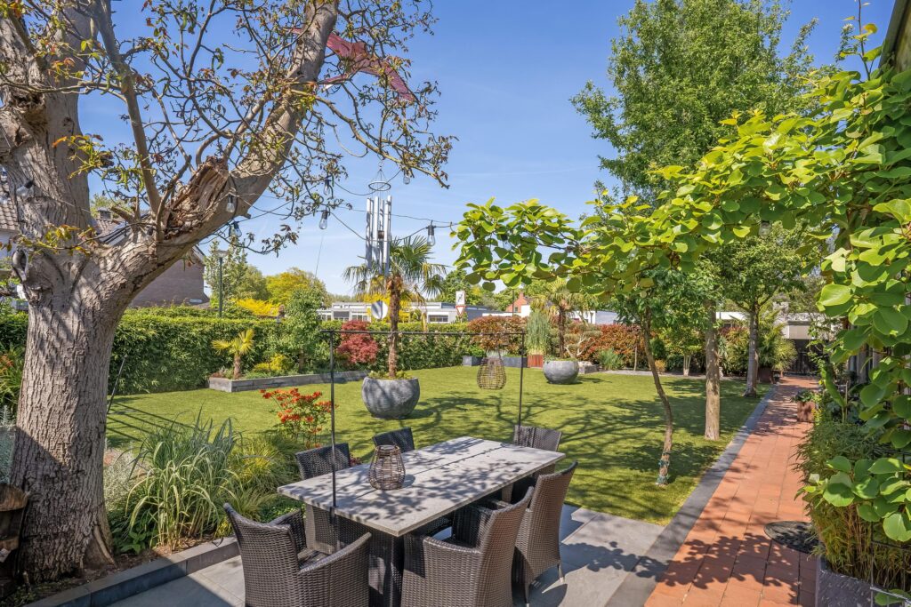 – Tuin met royaal overdekt terras, vijverpartij en verwarmd zwembad;