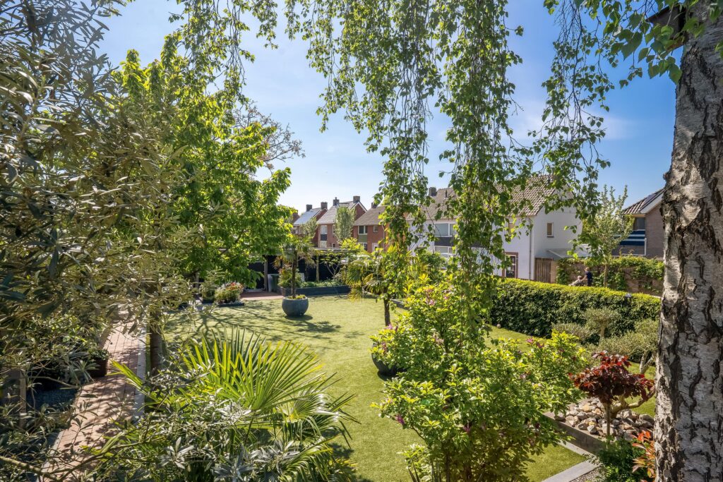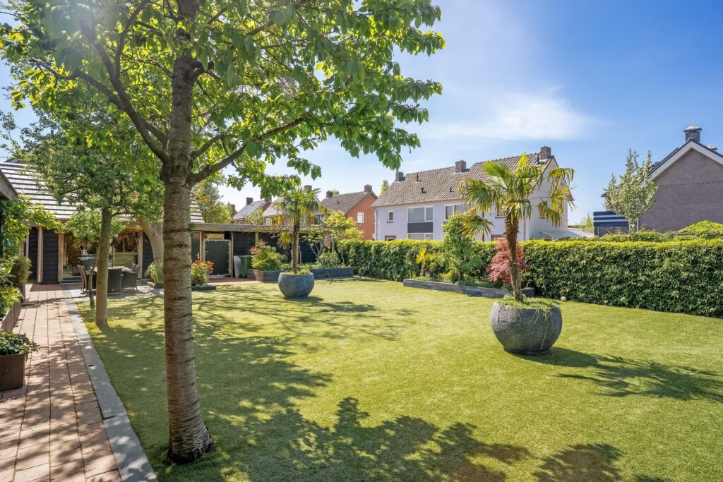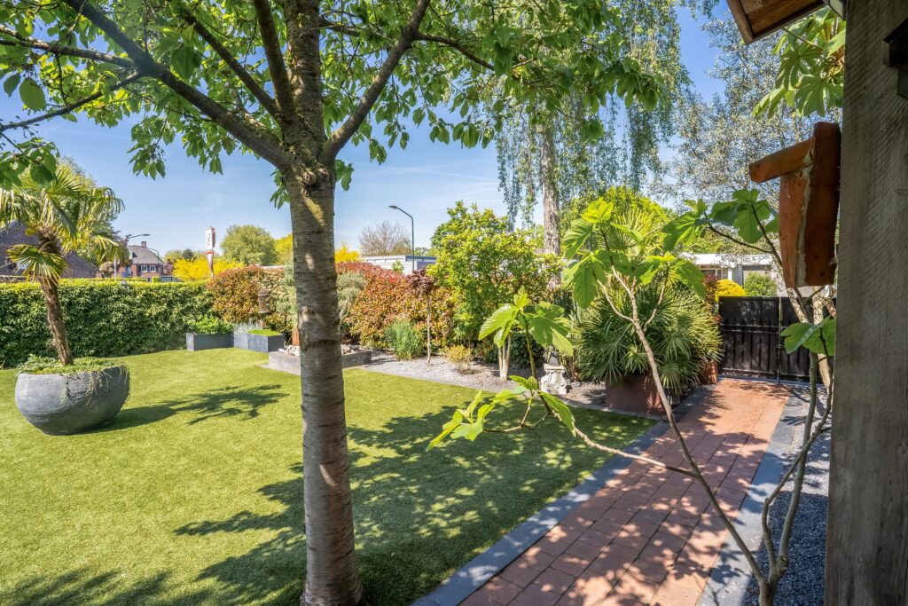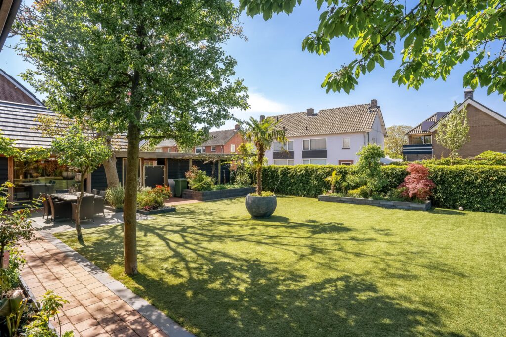 De keurig aangelegde tuin is voorzien van een ruim overdekt terras met een buitenkeuken. Daarnaast heeft de woning een overkapping met daarbij een jacuzzi. De tuin is bereikbaar middels een voor- en een achterom en biedt toegang tot het zwembad en de carport.