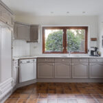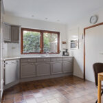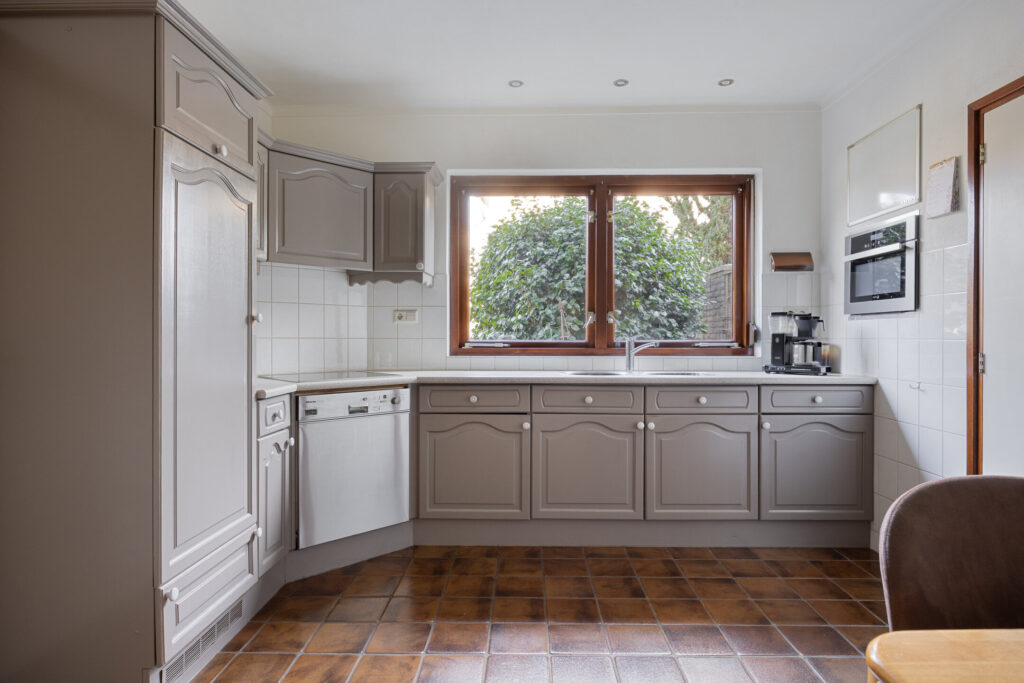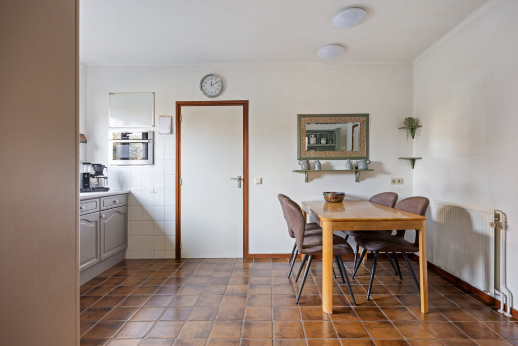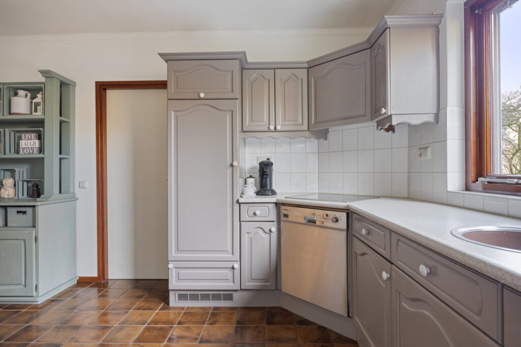 De dichte keuken is bereikbaar vanuit zowel de hal als de woonkamer en is uitgerust met een 4-pits keramische kookplaat, een combi-oven, vaatwasser en koelkast. Diverse boven- en onderkasten zorgen voor volop bergruimte.