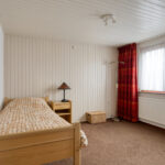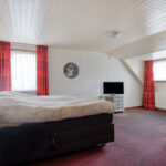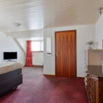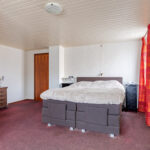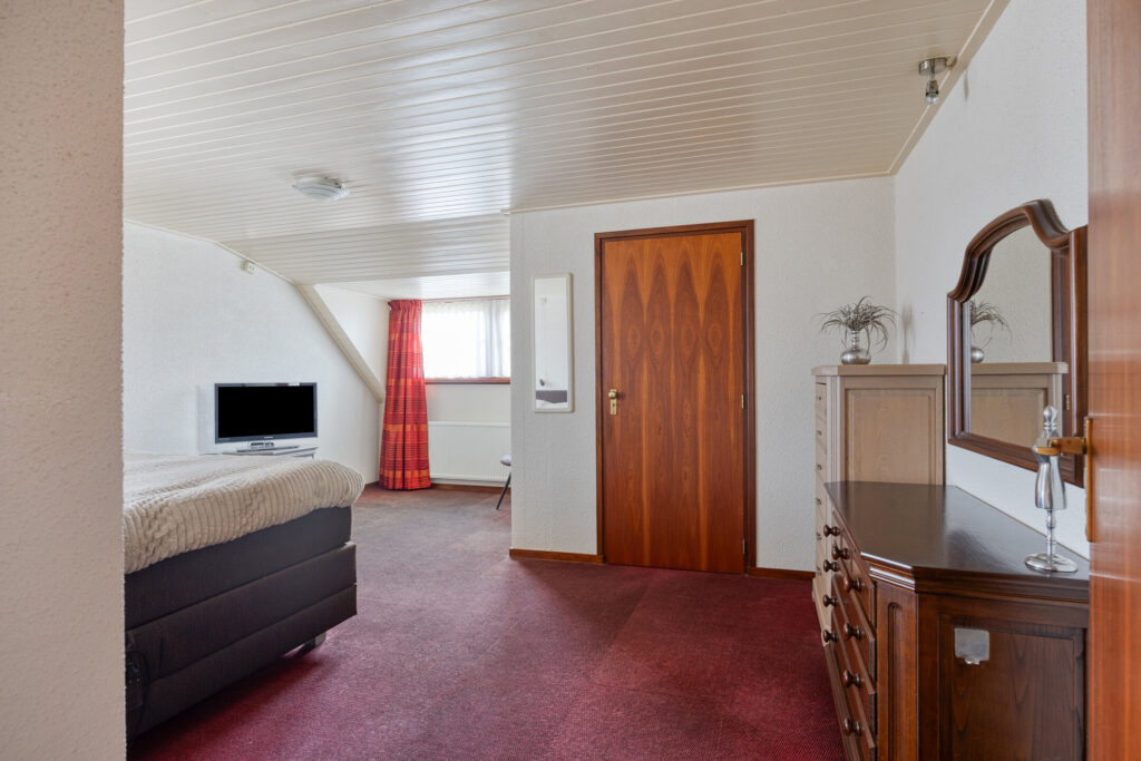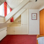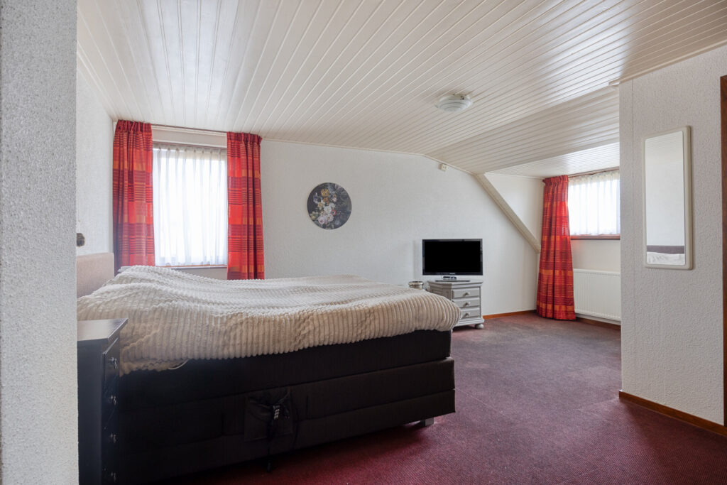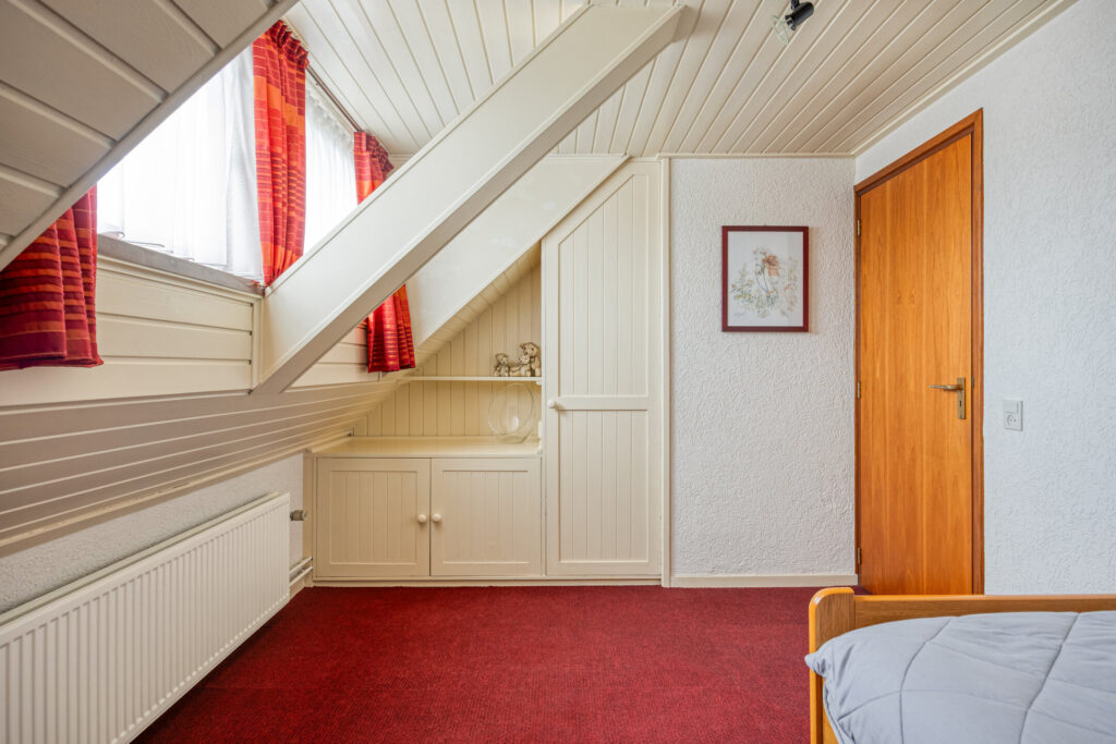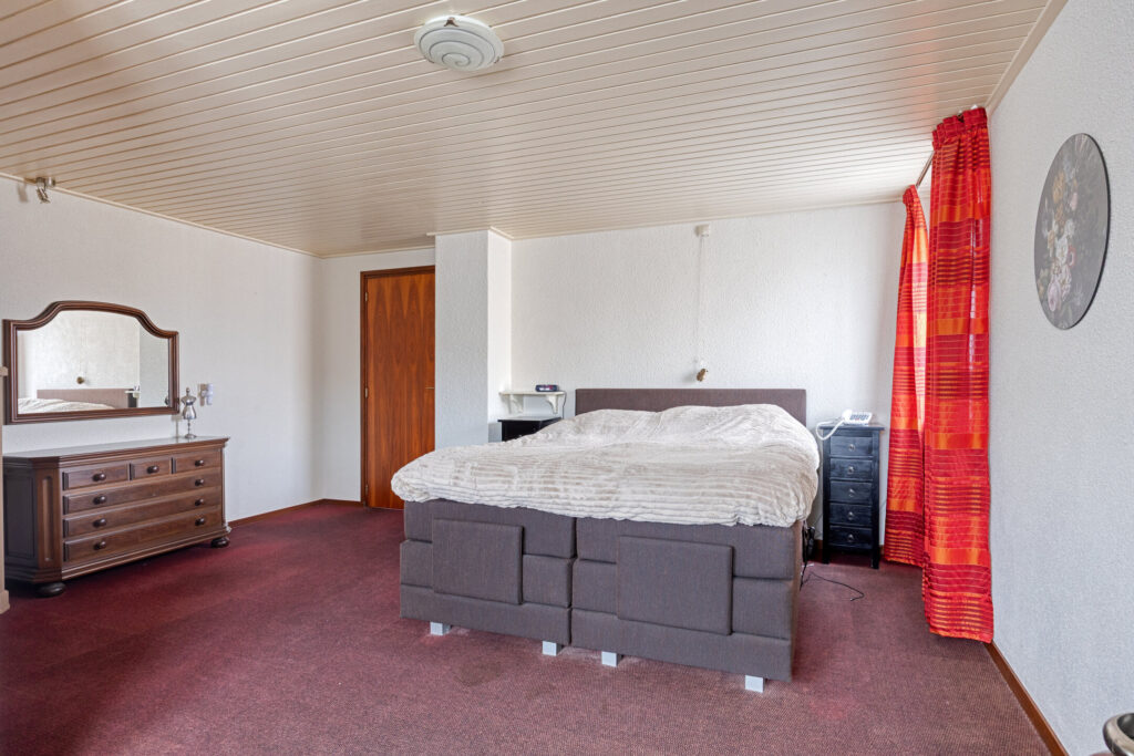 De ruime ouderslaapkamer is uitgerust met een dakkapel en een vaste kast. Dankzij de royale afmetingen (4,9 x 4,5) is er voldoende ruimte om bijvoorbeeld een inloopkast te realiseren. De kamer is afgewerkt met spachtelputz op de wanden, een houten schottenplafond en een tapijtvloer.